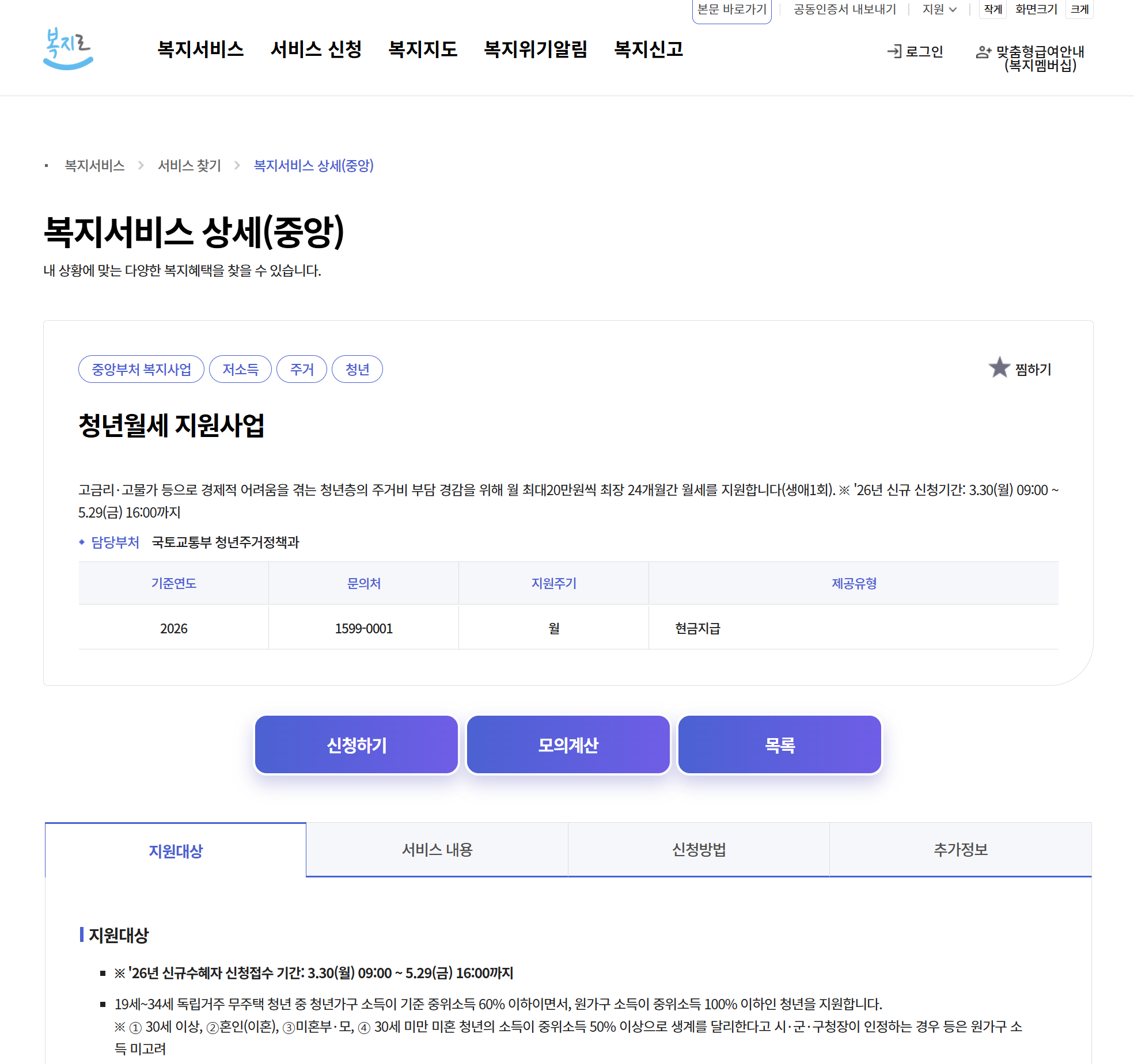 ▲ 복지로 청년월세지원 신청 화면 · 출처: 보건복지부 복지로 (bokjiro.go.kr)