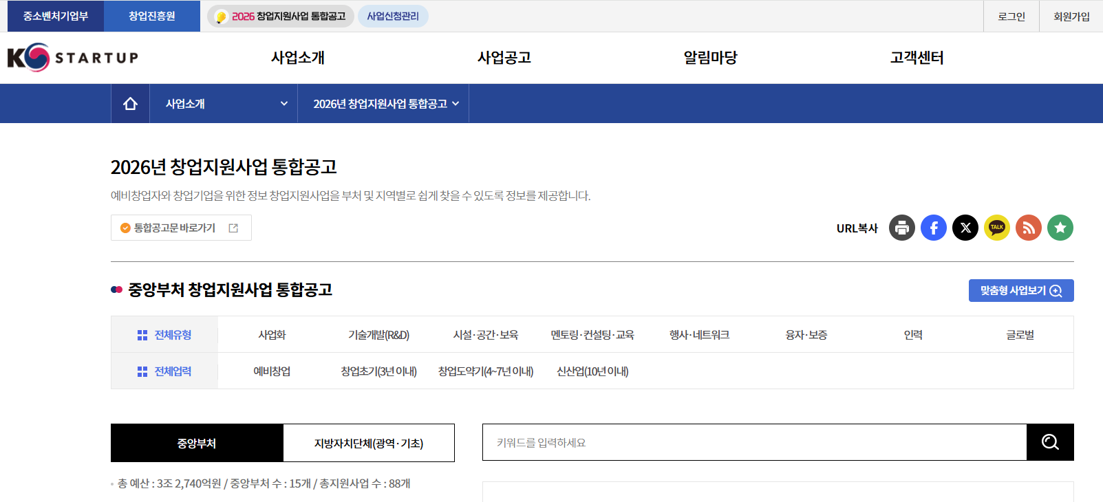 ▲ K-Startup 2026년 창업지원 통합공고 화면 (출처: K-Startup www.k-startup.go.kr)