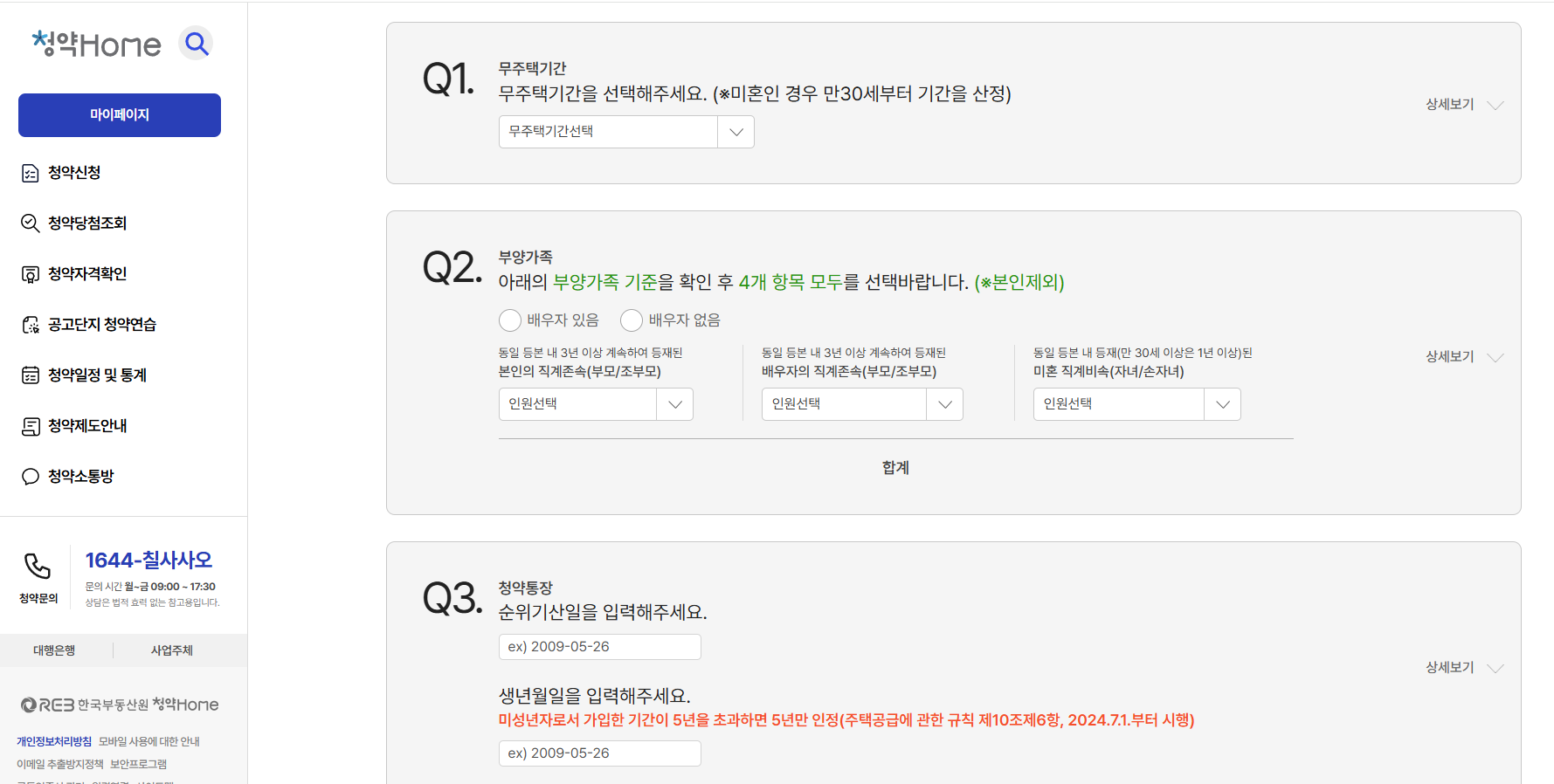 ▲ 청약홈 청약 가점 계산기 화면 (출처: 한국부동산원 청약홈 applyhome.co.kr)