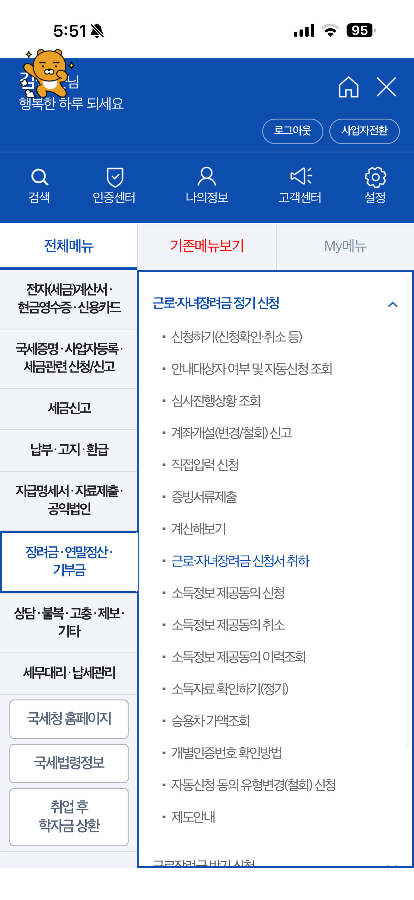 ▲ 손택스 앱 전체메뉴 → 장려금·연말정산·기부금 → 근로·자녀장려금 정기신청 화면
