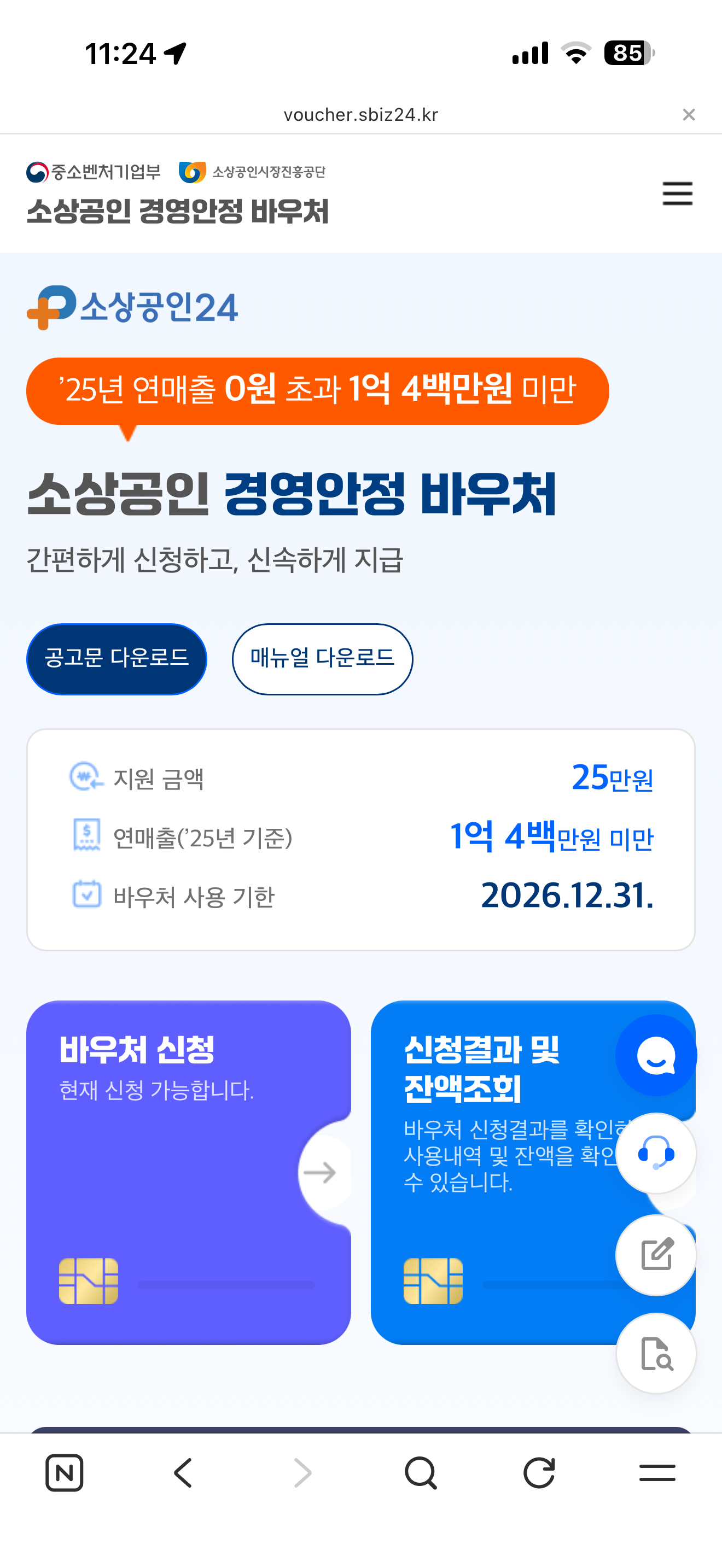 - 1단계 — 소상공인 경영안정 바우처 사이트 접속: voucher.sbiz24.kr 또는 소상공인24(sbiz24.kr)